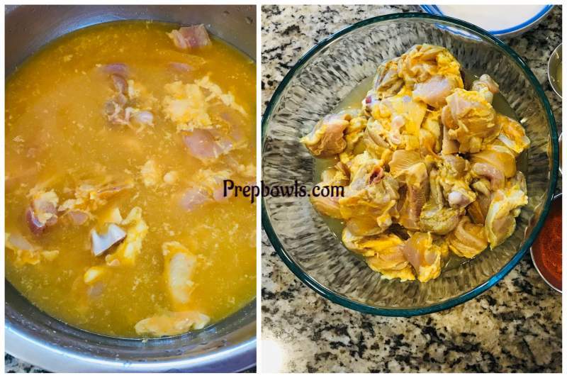 - Cleaning the chicken (optional) – cut the chicken into small pieces and take the cut chicken pieces in a bowl and add 3 tablespoons - white distilled vinegar , 3/4 th teaspoon - turmeric , 1 teaspoon - salt, 2 tablespoon - plain yogurt and water to cover the chicken. Mix it well and let it sit for 15 minutes. Now drain the water and rinse the chicken with fresh water once , drain the water completely and set the chicken pieces aside for marination.