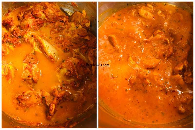 In this recipe, first I marinate the chicken for an hour or more if you have time ( or you can cook it immediately) , then dump the marinade in to the sautéed masala, and pressure cook it, so easy right? I absolutely found no taste difference when compared to the traditional cooking method, flavors turned out scrumptious, and the chicken cooks perfectly tender and juicy. Also it took me less time to prepare, so no more going back to stove top method.