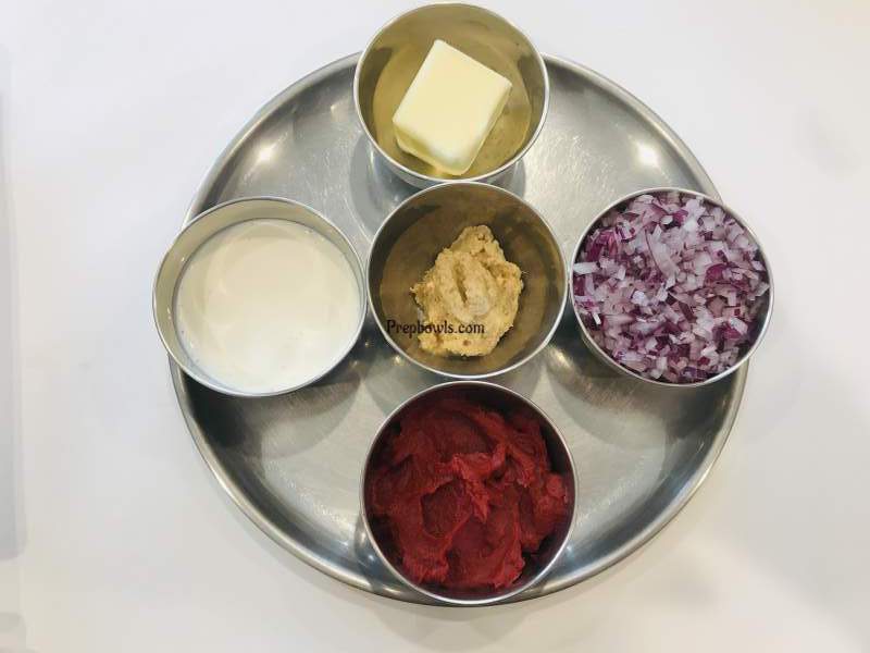 Ingredients required to make the curry – thick tomato paste (recommended), heavy cream ( can leave it outside from the fridge when you start cooking, helps the cream to thaw to room temperature), unsalted butter , finely chopped onions, ginger and garlic paste , water and white granulated sugar ( is missing in the picture below).