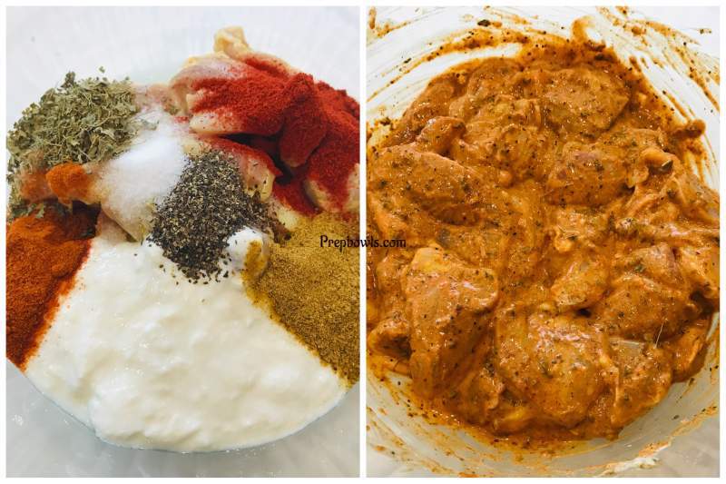 Clean and cut the chicken, and measure all other ingredients and keep it ready. Ingredients for chicken marination – clean and cut chicken into one inch stripes or cubes , plain yogurt, pepper powder, tandoori masala powder (recommended) , plain chilli powder , kashmiri chilli powder (recommended) , salt , kasoori methi and lemon juice.
