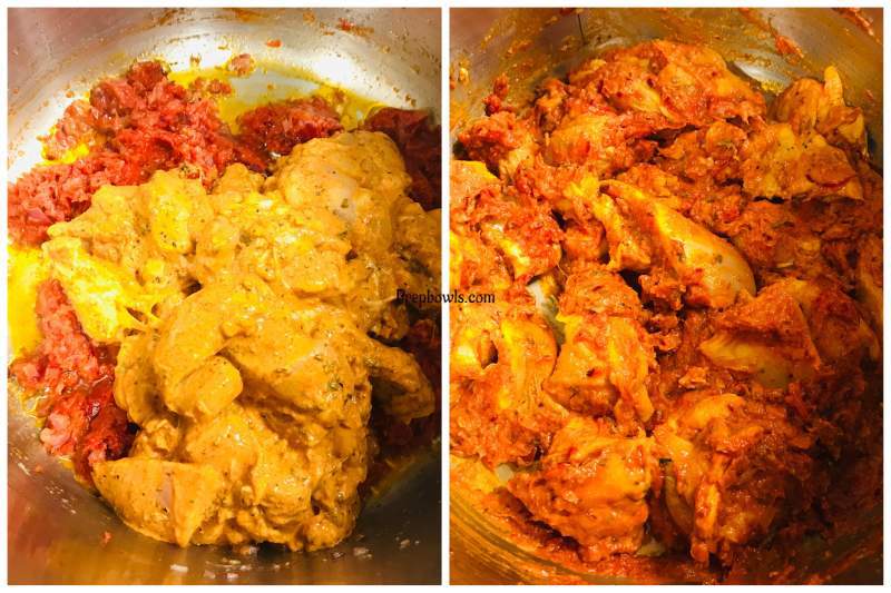 - In a bowl , add all ingredients under chicken marination , mix well and let the marinade rest for one hour or more if you have time ( but not mandatory) , or marinate and cook immediately. Instant Pot Cooking – SAUTE