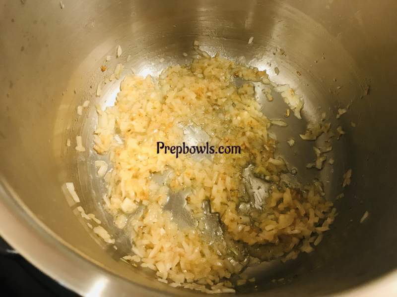 Take the Instant Pot and place the Inner Pot. Press SAUTE mode on HIGH power. In CUSTOM settings, SET Timer to FIVE minutes. Now Press START. Once it is ready and preheating is done. Add unsalted butter, once butter is melted add the minced garlic and saute just until fragrant or slightly brown , now add the yellow chopped onions and saute for ONE minute – till it turns slightly brown.