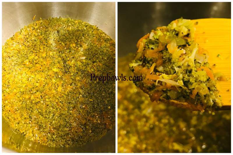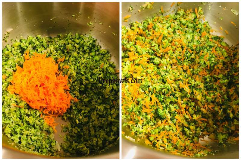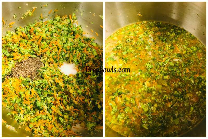 - Take the Instant Pot and place the Inner Pot. Press SAUTE mode on HIGH power. In CUSTOM settings, SET Timer to FIVE minutes. Press START. Once it is ready and preheating is done. Add unsalted butter, once butter is melted add the minced garlic and saute just until fragrant or slightly brown , now add the yellow chopped onions and saute for ONE minute - till it turns slightly brown. Add very finely chopped broccoli and thinly shredded carrots and stir once. Add vegetable broth , pepper powder and salt and stir well. Press CANCEL . PRESSURE COOKING