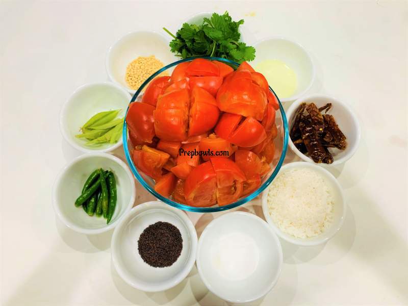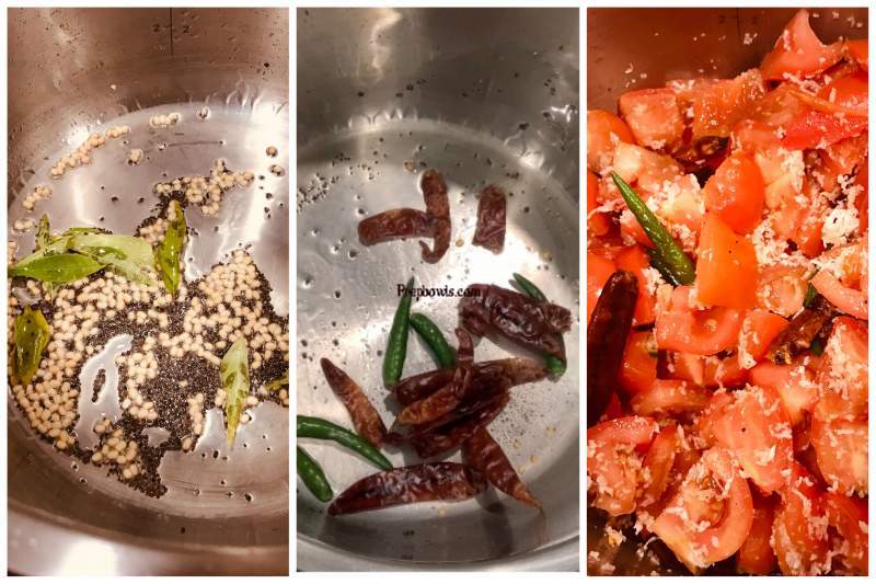 Preparation and Ingredients required : – Roughly chop tomatoes into small pieces or use chopper to break it down ( shape doesn’t matter), oil, mustard seeds, urad dal, curry leaves, dry whole red chillies, fresh whole green chilles, fresh shredded coconut , fresh cilantro leaves, and salt.