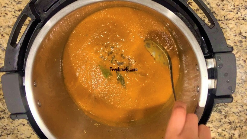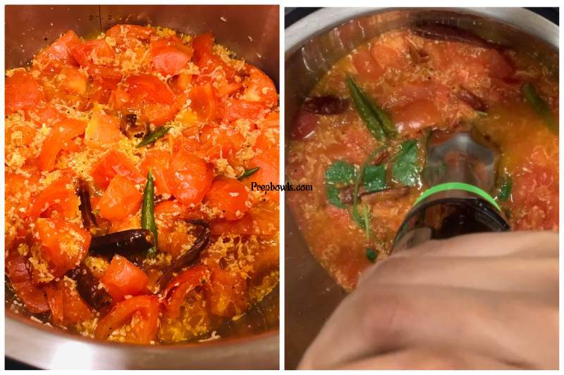 - I used Instant Pot Duo Evo Plus 8 Quart for cooking. Place the inner vessel into the Instant Pot. Press SAUTE mode on HIGH power. In CUSTOM settings, SET Timer for FIVE minutes. Now Press START. Once it is ready and preheating is done ( you’ll get a beep sound), add oil , mustard seeds , urad dal and curry leaves and temper. Sauté for ONE minute, remove the tempering completely from the pot and set aside to add it later . Now add green chillies and dry red chilles and sauté for ONE minute. Then add chopped tomatoes, salt and shredded coconuts and mix well and sauté for approximately for ONE minute. Press CANCEL. Pressure Cooking